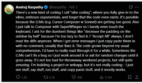 The first instance of the term appeared in a tweet posted by Karpathy in February of this year, where he described ‘vibe coding’ as “fully giv[ing] into the vibes, embrac[ing] exponentials, and forget[ting] that the code even exists.”